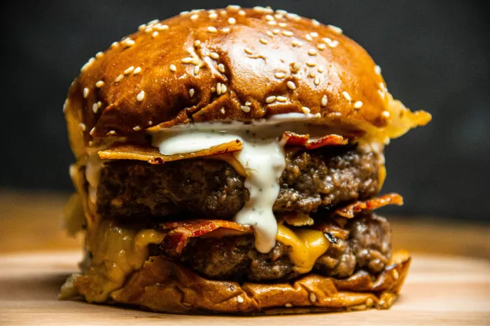 Högrevstacoburgare med briochebröd, dubbel cheddarost, Stekt bacon,  stekt tomat, Stek lök ,  BBQ sås, picklad gurka,  pommes Tryffelmajonnäs