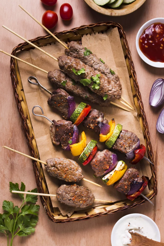 marinerad oxfilé , fläskfilé , kebabkött, vitlökssås, bearnaisesås, kebabsås