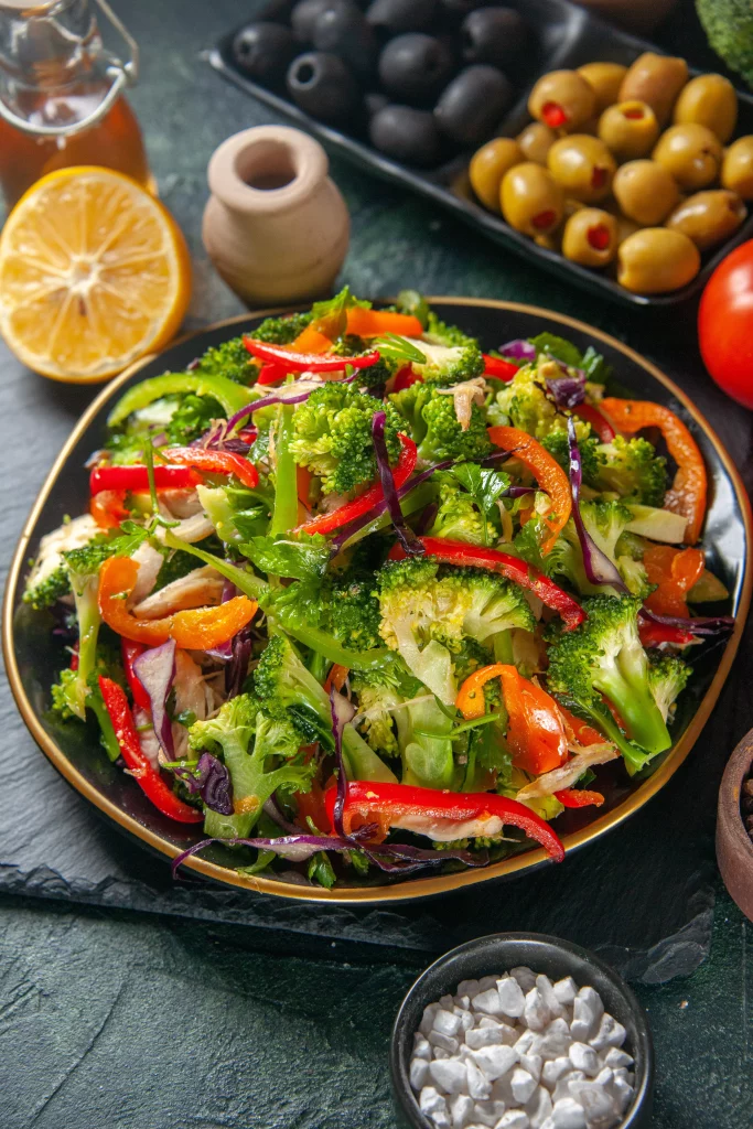 fetaost, sallad, tomat, gurka, paprika, oliver, dressing